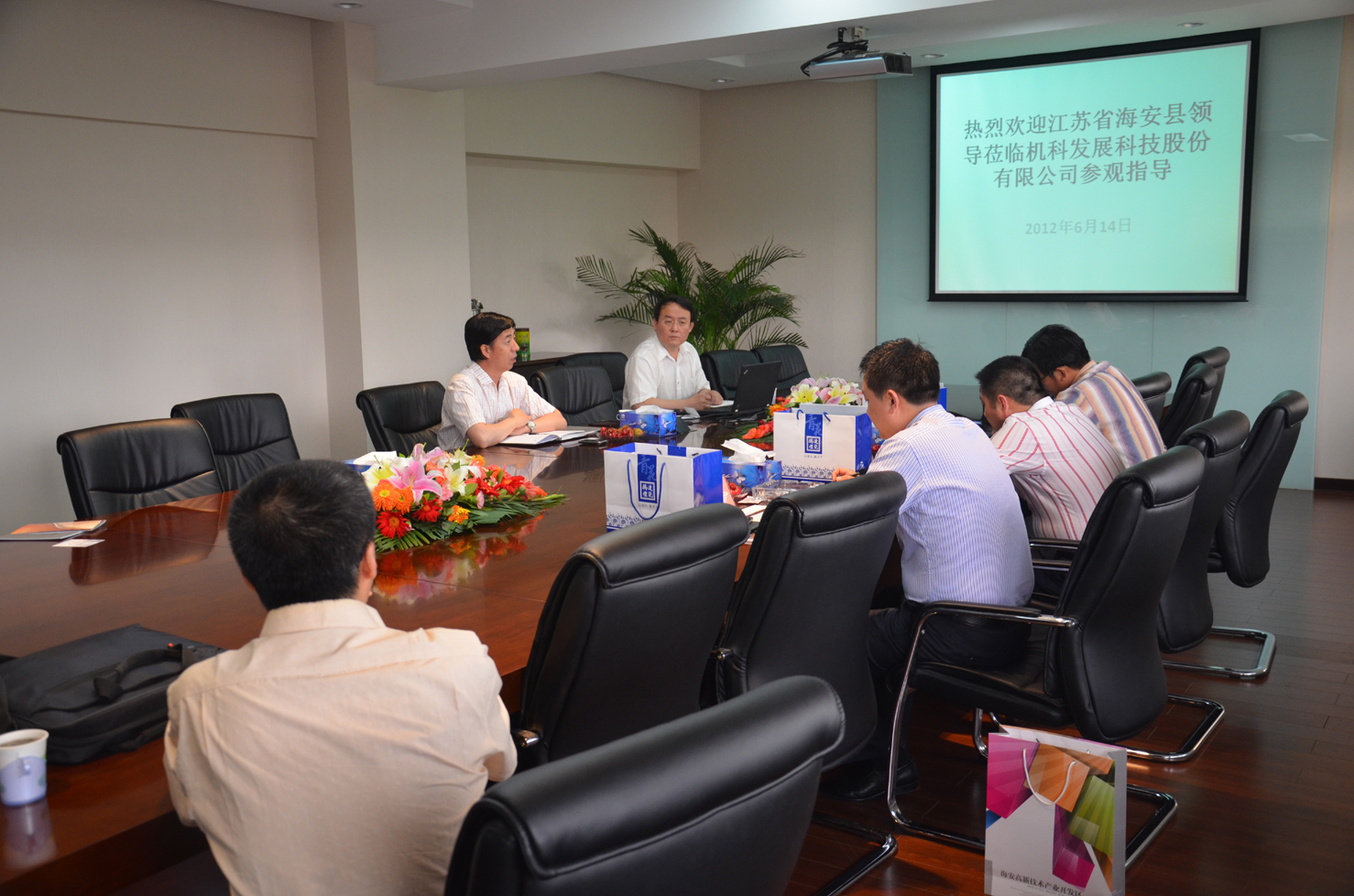 首先,楼上游书记对客人的到来表示热烈欢迎,简要介绍了公司的基本情况,对下一步的业务发展以及产业化基地建设等向客人做了说明。孙振田部长代表公司做了业务情况的汇报,介绍了公司参加德国汉诺威展览的情况以及公司四个事业部业务的整体情况和技术特点,来宾对公司的业务情况表现了极大的期盼,希望公司的产品、技术等能够在海安落地、开花、结出硕果。