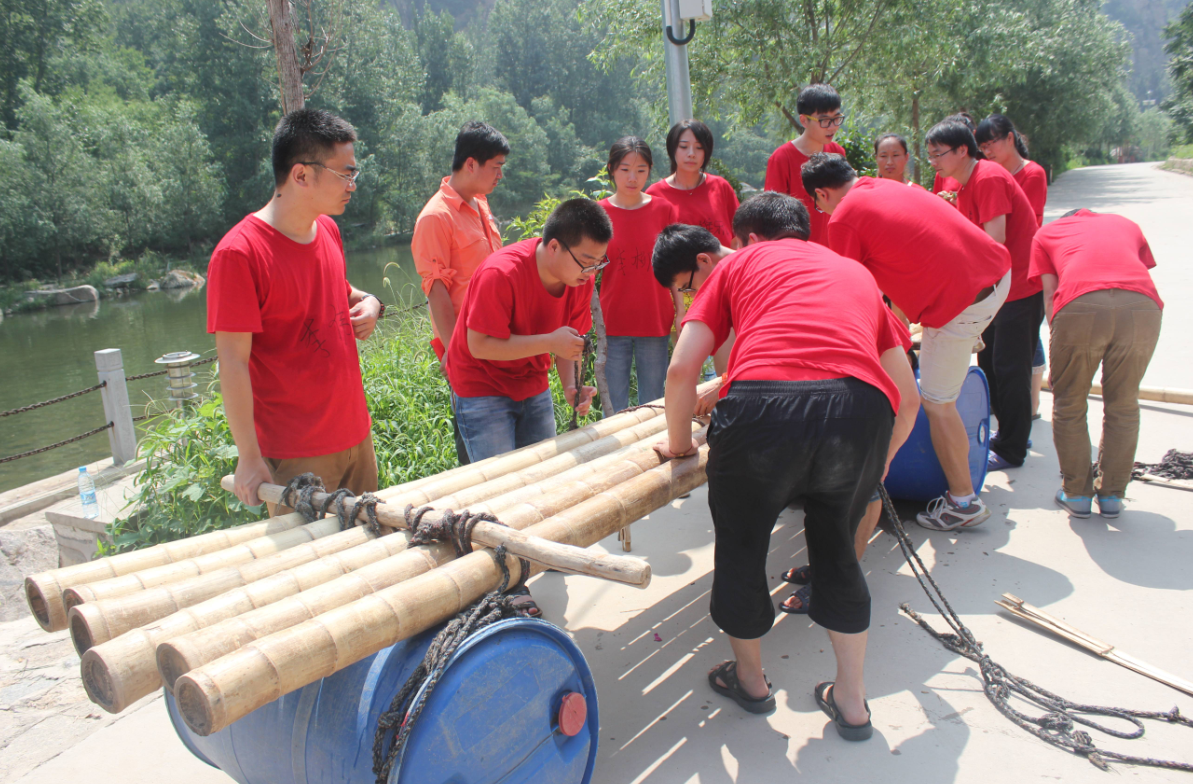 在扎筏泅渡拓展训练项目中,两队在特定的时间内,坚定目标,同心协力,利用所给的毛竹、麻绳、大塑料桶集体动手创作出劳动成果,扎出结实的竹筏,驶向成功的彼岸。