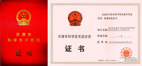 本次获奖项目是由天津立中集团旗下子公司天津那诺机械制造有限公司牵头,联合机科发展科技股份有限公司、天津市天锻压力机有限公司三家单位共同申报的“高强韧轻量化车轮液态模锻雷竞技足球网址关键技术与创新应用”项目喜获2021年度天津市科学技术进步二等奖。