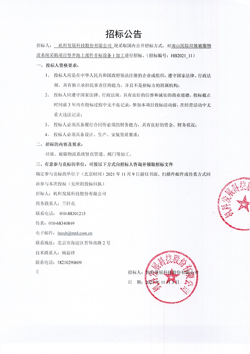 HB2021_11南山医院垃圾被服物流系统采购项目竖井地上部件非标设备1加工招标公告