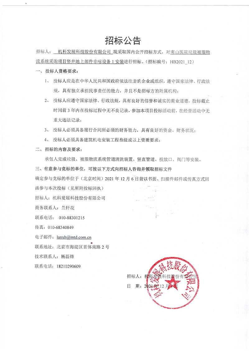 HB2021_12南山医院垃圾被服物流系统采购项目竖井地上部件非标设备1安装招标公告