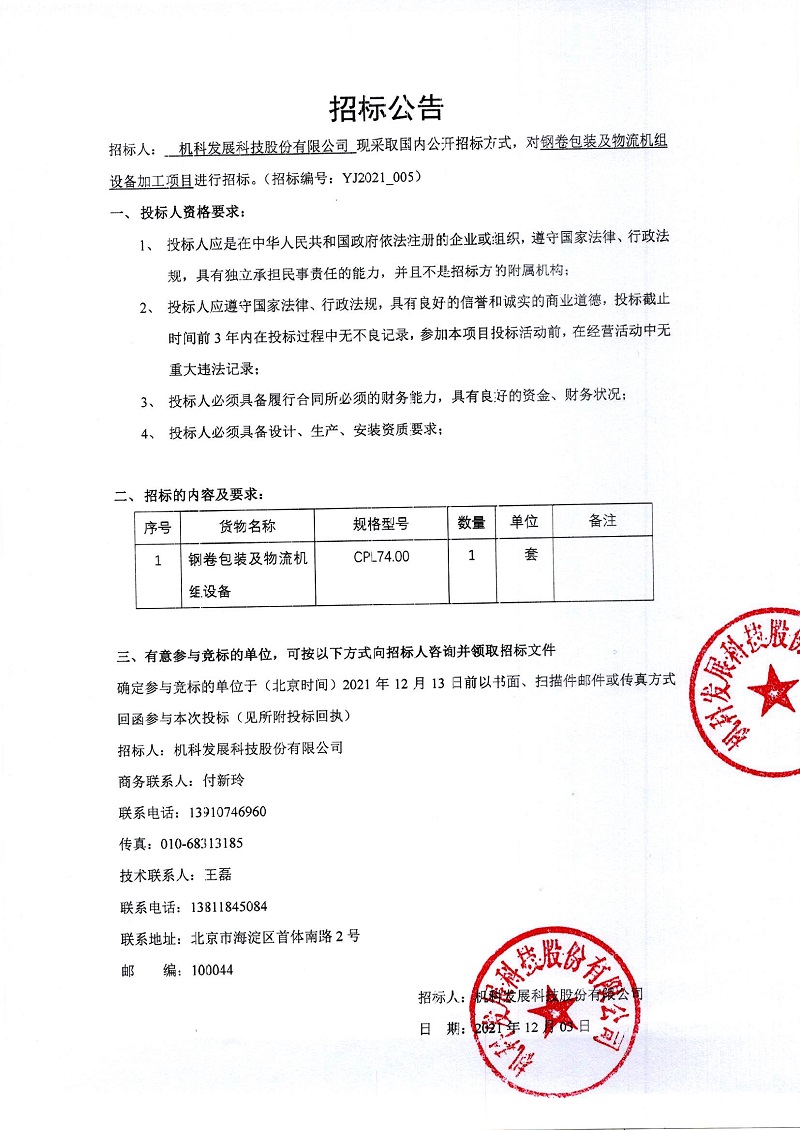 YJ2021_005钢卷包装及物流机组设备加工项目招标公告