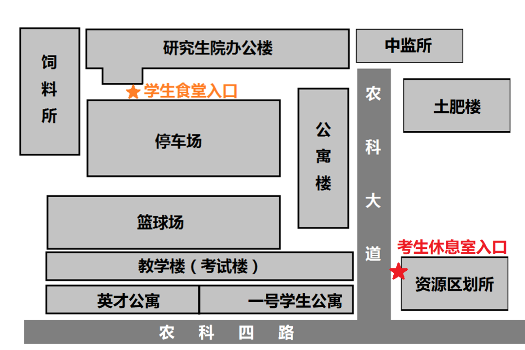 1.普通考场:受疫情影响,我院学生食堂暂未开放堂食。考生考试当天中午可进入我院学生食堂购买盒餐并打包带走。另外中国农业科学院院内及周边有便利店、饭店等可供考生自行选择。