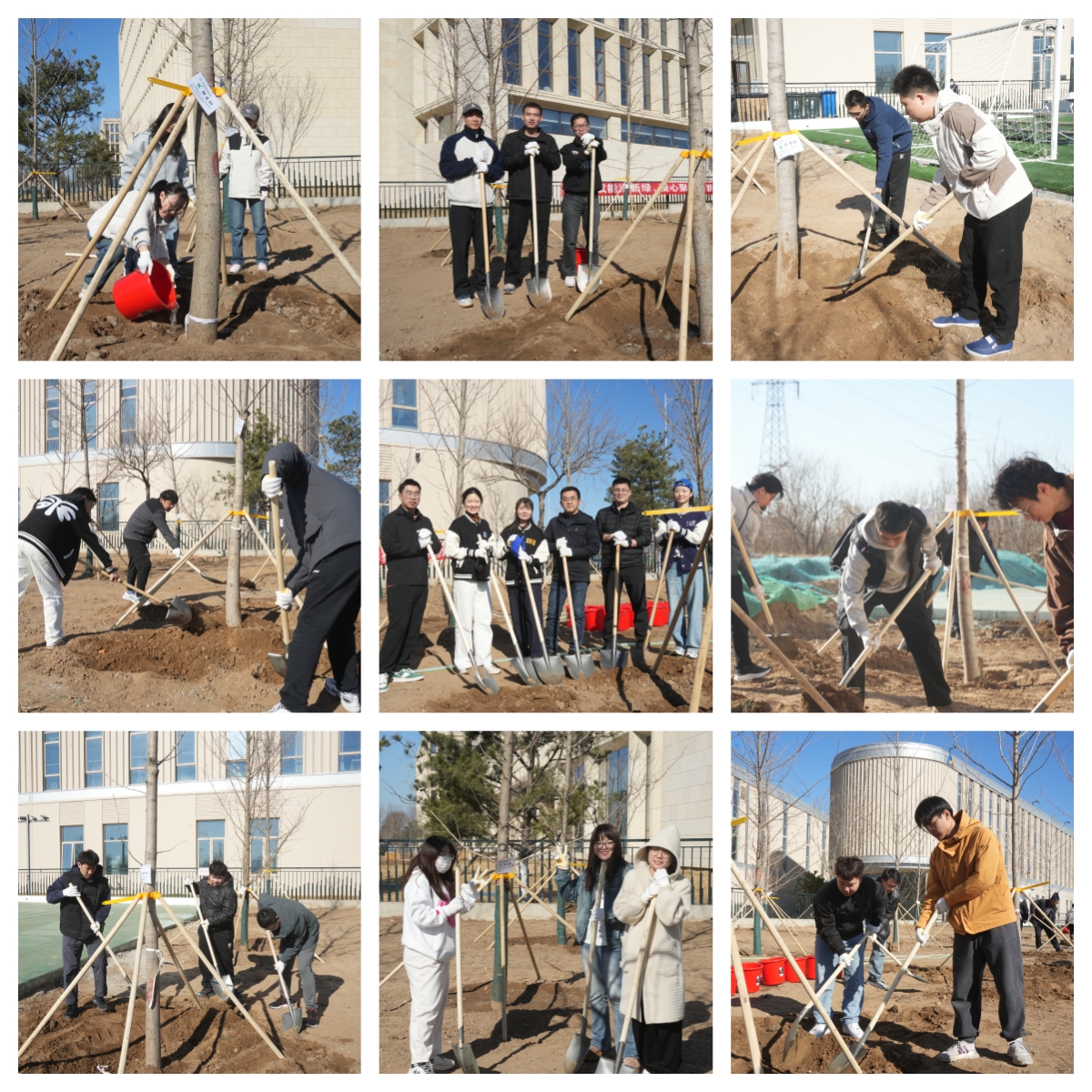 活动现场,同学们热情高涨,在听取了园艺师对于植树的讲解后,挥锹铲土、扶苗培根、提桶浇灌,分工协作默契十足。一株株新栽的银杏树整齐挺立,沿着怀柔基地球场旁的土地绵延成行,共同记录着青年学子与树木共成长的绿色足迹。