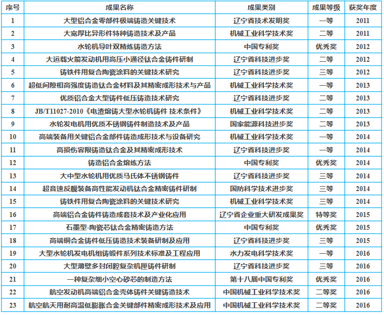 建所以来,本所承担了众多国家科技项目和国防军品配套项目,至今已取得科研成果600余项,其中国家级奖励18项、省部级奖励200余项,拥有有效授权专利61项,其中发明专利53项。组织制修订铸造专业国家标准和行业标准近300项,其中主持和参与起草的铸造国家标准和行业标准177项,为我国铸造行业工艺水平的提高、装备水平的升级和技术进步提供了技术支撑。