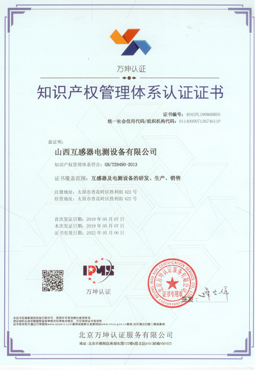 知识产权管理体系认证证书