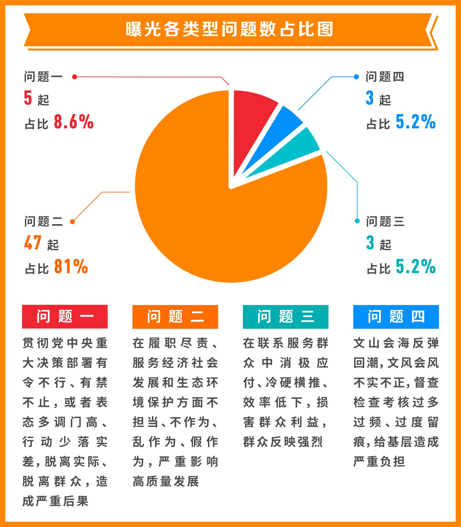 从具体问题类型看,“贯彻党中央重大决策部署有令不行、有禁不止,或者表态多调门高、行动少落实差,脱离实际、脱离群众,造成严重后果”方面问题5起,占比8.6%;“在履职尽责、服务经济社会发展和生态环境保护方面不担当、不作为、乱作为、假作为,严重影响高质量发展”方面问题47起,占比81%;“在联系服务群众中消极应付、冷硬横推、效率低下,损害群众利益,群众反映强烈”方面问题3起,占比5.2%;“文山会海反弹回潮,文风会风不实不正,督查检查考核过多过频、过度留痕,给基层造成严重负担”方面问题3起,占比5.2%。
