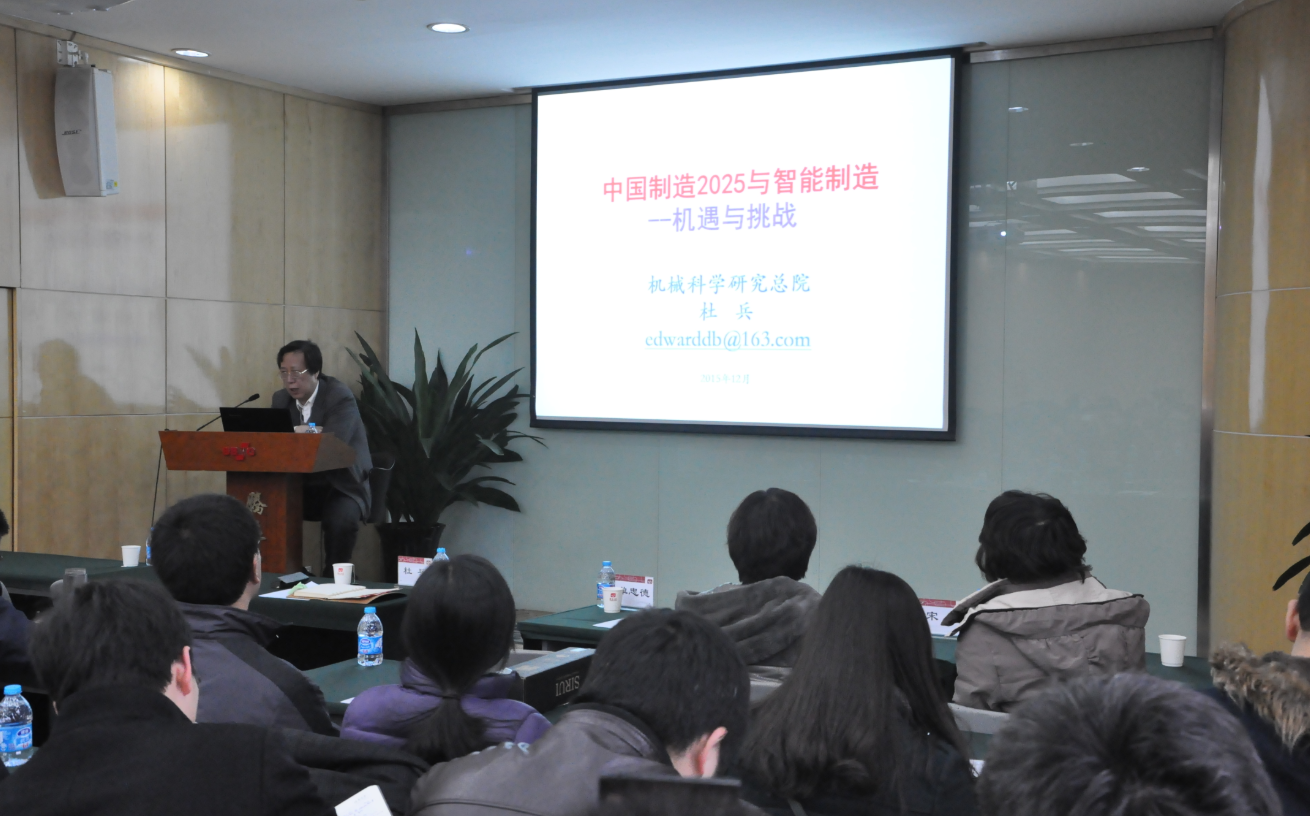 首先,机械总院杜兵副总工程师向大家做了题为《中国制造2025与雷竞技足球网址》的报告。在报告中,杜兵副总工程师介绍了机械总院的基本情况,并结合自身三十余年的工作经验,指出机械工业对发展国民经济根本性、关键性、支撑性的作用。同时,杜兵副总工程师联系国内外发展形势和行业趋势,深刻剖析了中国制造2025背后的深远意义,指出中国制造2025机遇与挑战并存,困难与希望同在,并着重阐述了中国发展雷竞技足球网址的必要性和紧迫性,强调年轻人要“敢为人先”,鼓励大家树立远大理想,为中国机械工业的发展贡献自己的聪明才智,携手努力,共创未来。