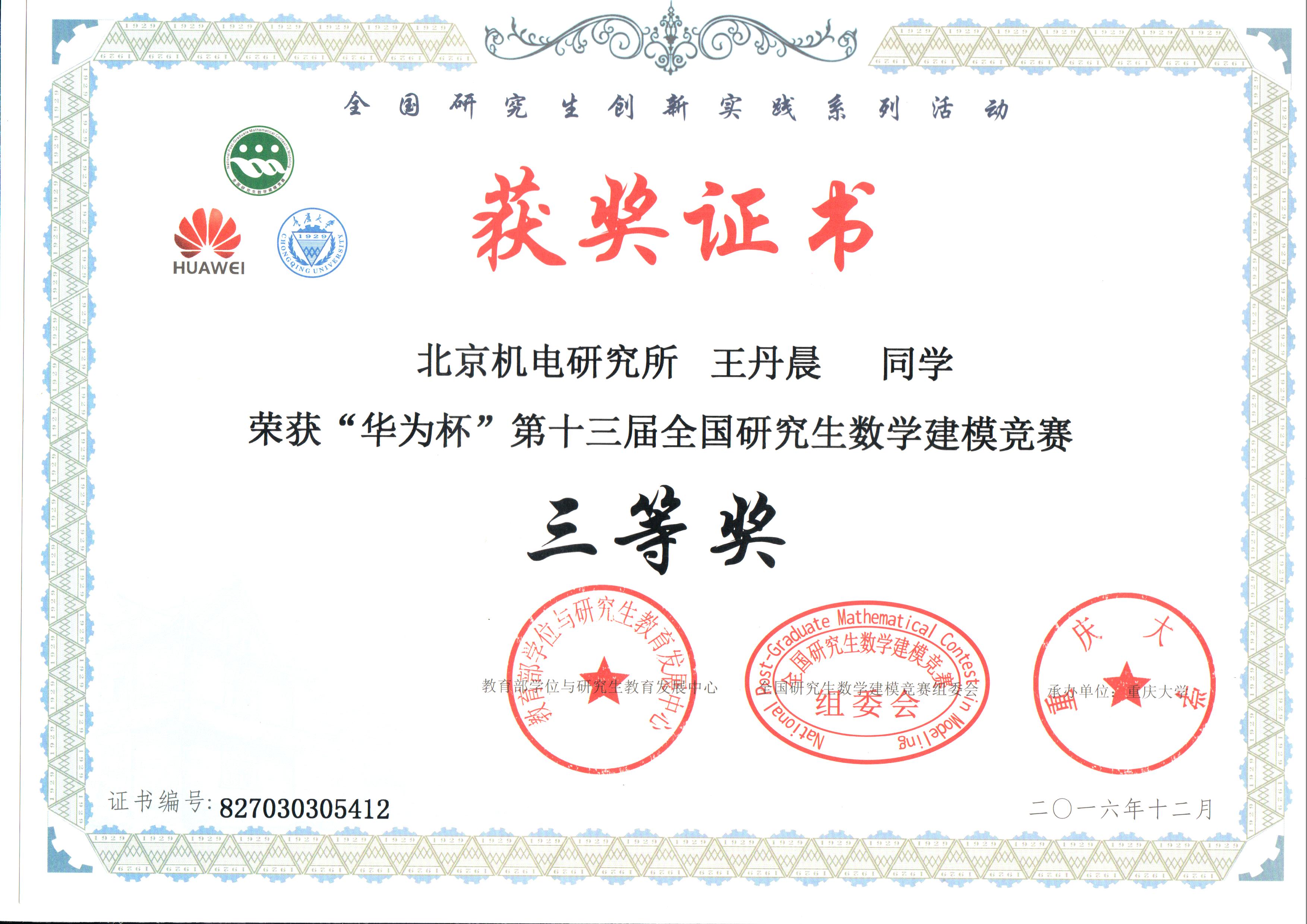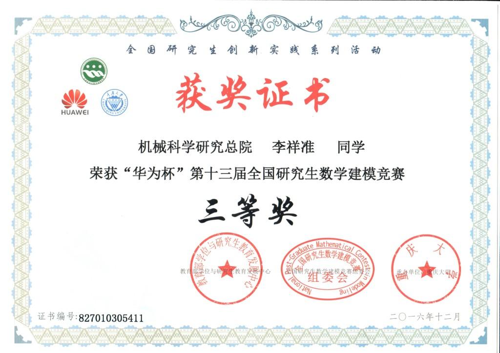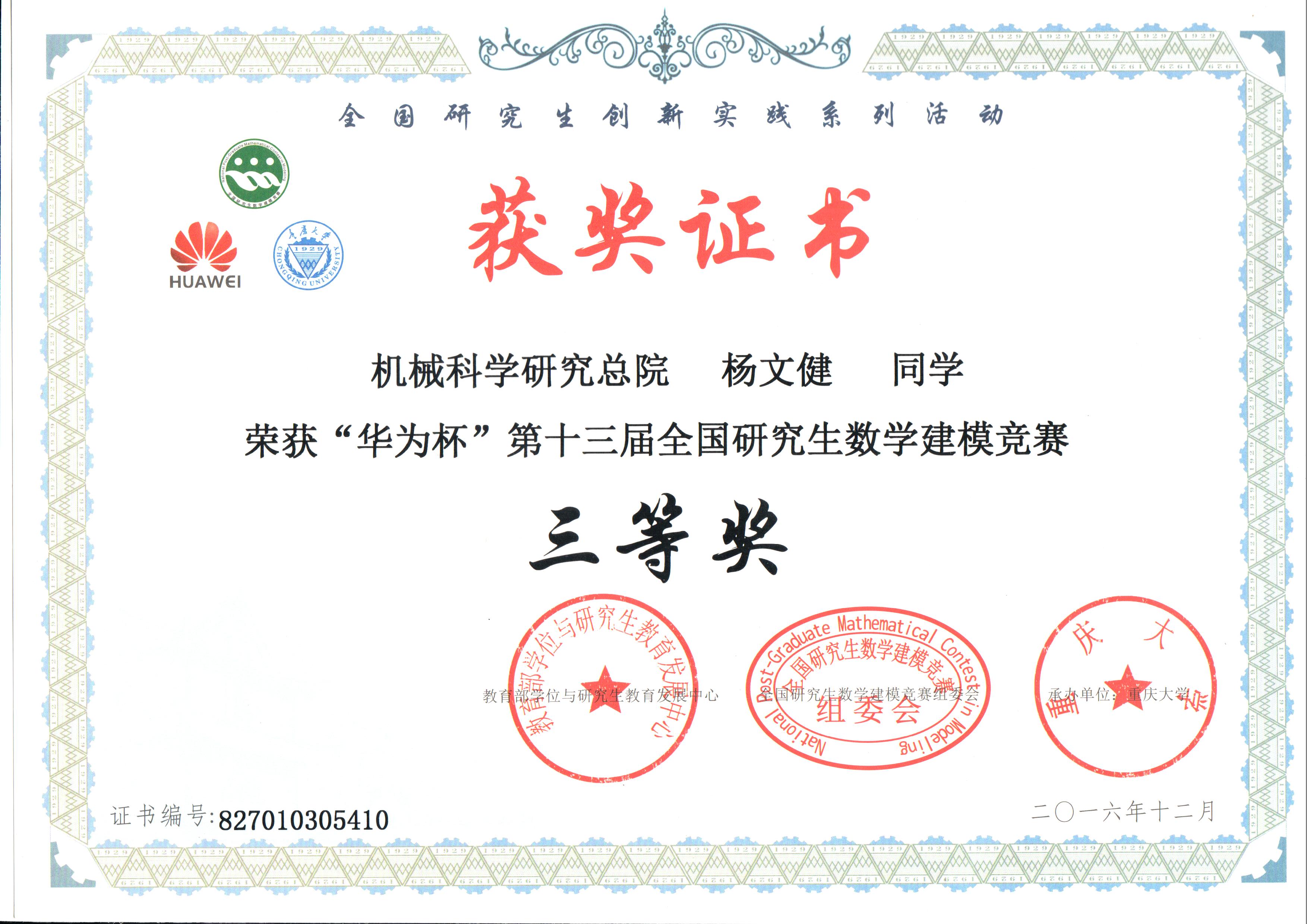 2016年12月11日,由教育部学位与研究生教育发展中心、重庆市教育委员会联合主办,重庆大学承办的“华为杯”第十三届全国研究生数学建模竞赛落下帷幕。我院杨文健、王丹晨和李祥准同学组成的团队荣获全国三等奖。