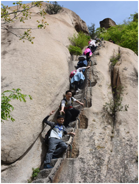 凤凰岭景区是国家4A级景区,山美水秀。一到山脚下,大家就被眼前的一片青山所吸引,在研会清点人数、安排好路线行程之后,大家立刻开始了北线攀登。都说北线险,开始大家并不以为然,对自己体力充满了自信,熟料峰一回,路一转,道路变得越发陡峭起来,从如履平地到小心翼翼再到手脚并用,特别爬到天梯那一段,几乎垂直向上,大家抓着铁索踩着石梯,互相鼓励,互相帮扶,一点一点向顶峰进发。在登山的过程中大家体会到,登山运动不是一个人完成的,没有团队合作是登不上最高峰的。爬过天梯,登顶那一刻,大家欢欣鼓舞,体会到了会当凌绝顶,一览众山小的感觉。