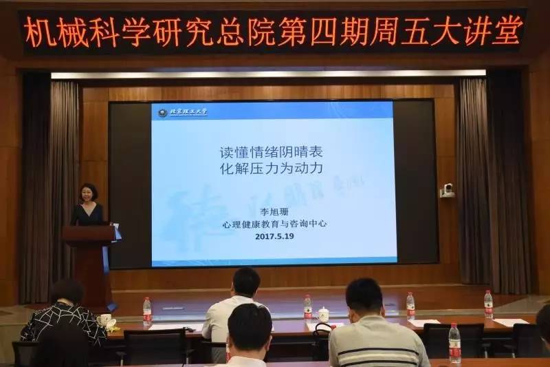 5月19日下午,机械科学研究总院第四期周五大讲堂在总院五楼报告厅召开。本期周五大讲堂邀请到北京理工大学心理健康教育与咨询中心李旭珊副教授,为总院研究生和工作人员作了一场题为“读懂情绪阴晴表化解压力为动力”的专题讲座。讲座由人力资源部部长王宇主持,研究生工作部常务副主任、人力资源部副部长宋浩、研究生和工作人员共五十余人参与了本次讲座。