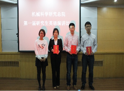 本次研究生英语演讲比赛共设“自命题演讲”、“抽词演讲”、“图文生义”三个项目。“自命题演讲”主题为“Share the Games, Share our Dreams”。比赛设团体将和单项奖。经过激烈角逐,院总部、北京机电研究所、沈阳铸造研究所和北京机械工业自动化研究所分别获得团体第一名、第二名、第三名和优秀组织奖。北京机械工业自动化研究所曹宇昕同学、北京机电研究所刘丽英同学和院总部王薇薇同学分别获得“自命题演讲”、“抽词演讲”、“图文生义”单项第一名。