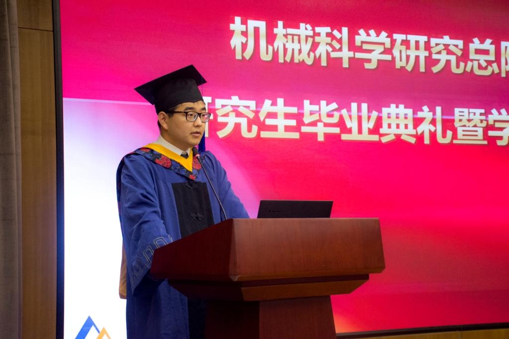 北京机电研究所李志强同学代表全体毕业研究生发表毕业感言,他感谢机械科学研究总院提供的学习环境和成长平台,感谢导师的谆谆教诲,感谢父母的养育之恩,他回顾了读研期间与同学们的难忘经历,倡议全体毕业生同学脚踏实地,为总院争光,并祝愿导师们桃李满园、祝愿总院事业蓬勃发展。