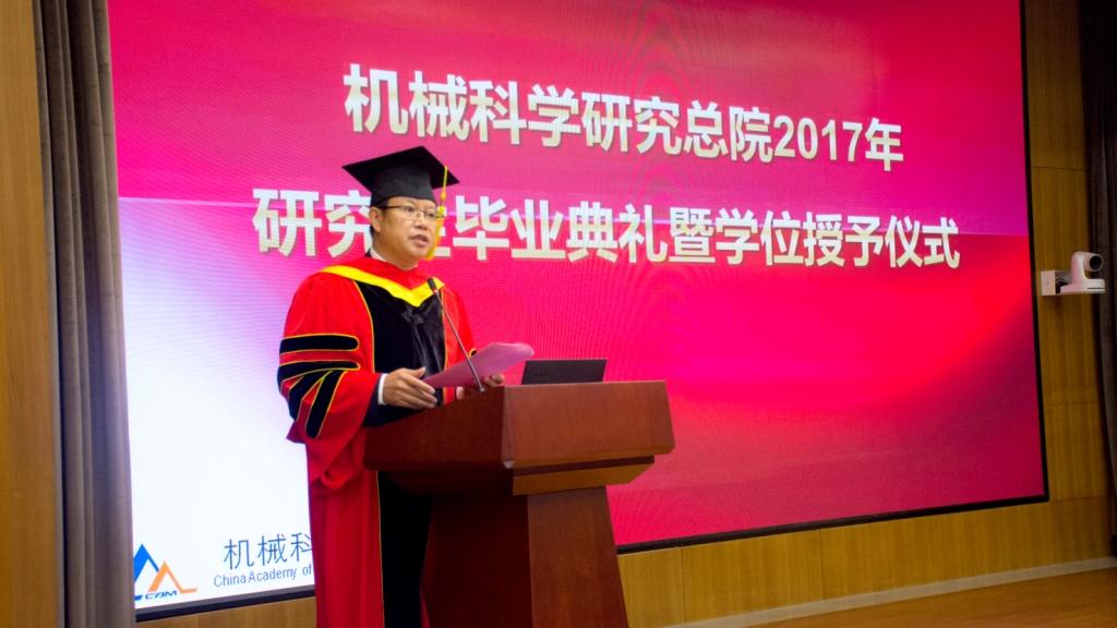 7月6日下午,机械科学研究总院2017届研究生毕业典礼暨学位授予仪式在京举行。机械科学研究总院学位评定委员会主席王德成院长、学位评定委员会委员副主席单忠德副院长以及其他学位评定委员会委员等出席典礼,来自集团各单位的70多名毕业研究生代表、导师代表、各培养单位的研究生管理人员以及部分毕业生亲属参加了典礼。典礼由机械科学研究总院学位评定委员会副主席单忠德副院长主持。